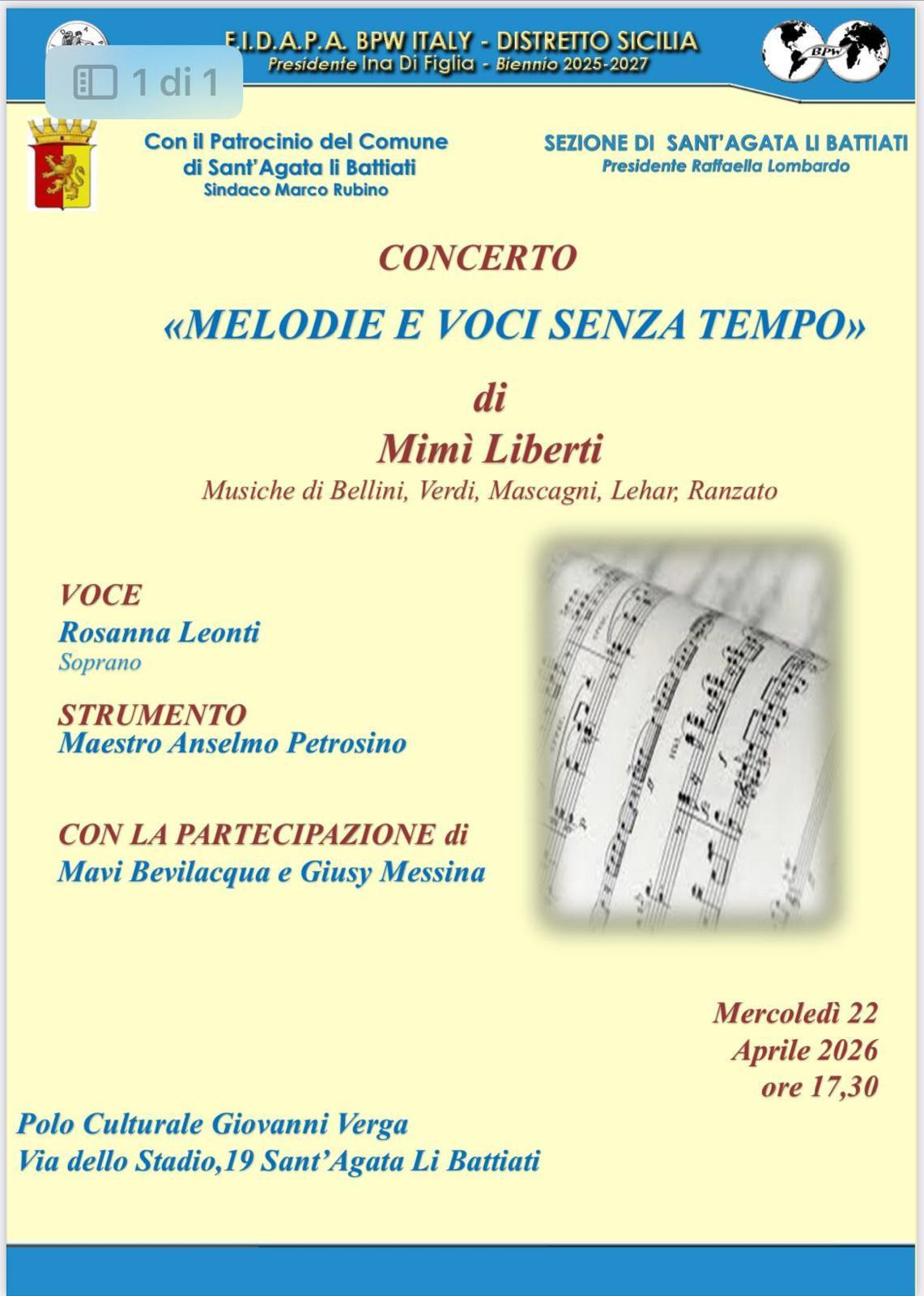 Alla voce la soprano Rosanna Leonti accompagnata dal maestro Anselmo Petrosino, con la partecipazione di Mavi Bevilacqua e Giusy Messina, mercoledì 22 aprile 2026 alle ore 17.30 avrà luogo presso il Polo Culturale "G. Verga" un concerto lirico con musiche di Bellini, Verdi, Mascagni, Lehar, Ranzato